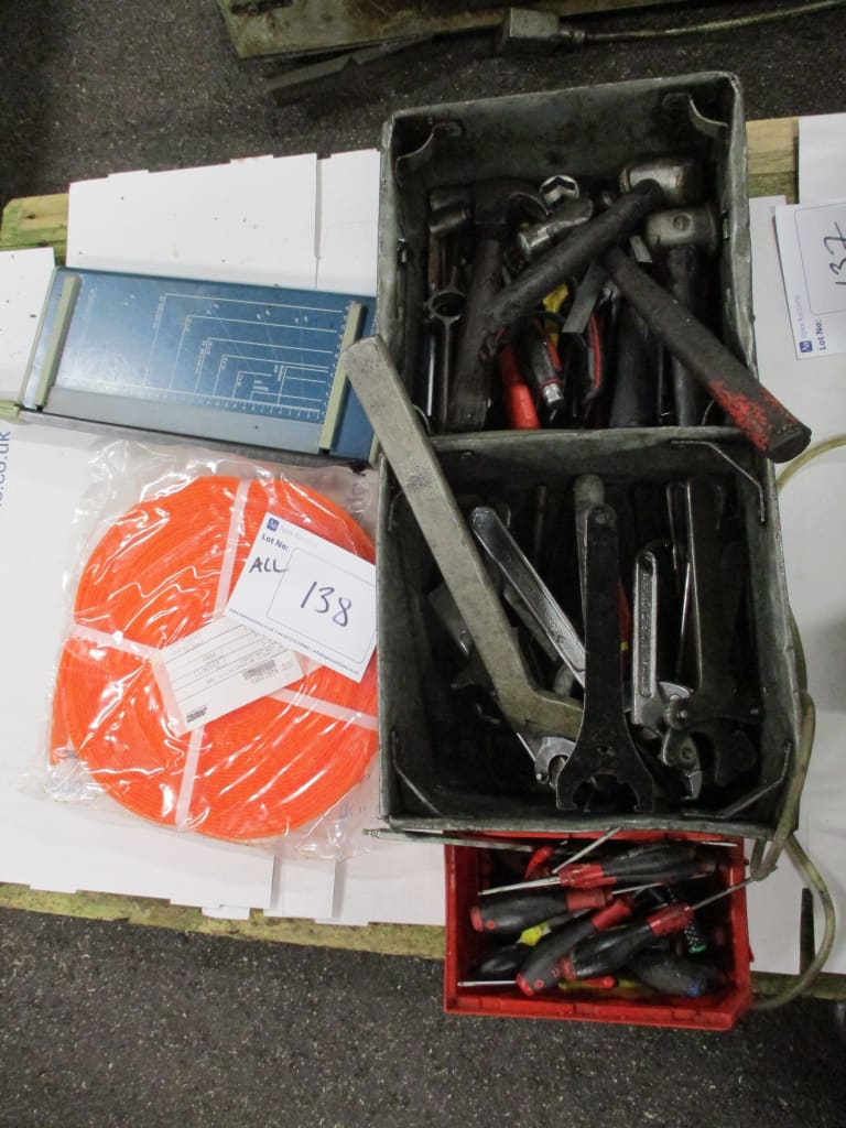 ViewFairbanks 6-14 Wood Platform Cart 72" x 36"Fairbanks 6-14 Wood Platform Cart 72" x 36"- View1 Lot Assorted ToolingIncluding: Torx Screwdrivers, 'C' Hook Spanners, Pliers, Dahle 502 Guillotine & Roll of 25mm Wide Orange Net Guard.