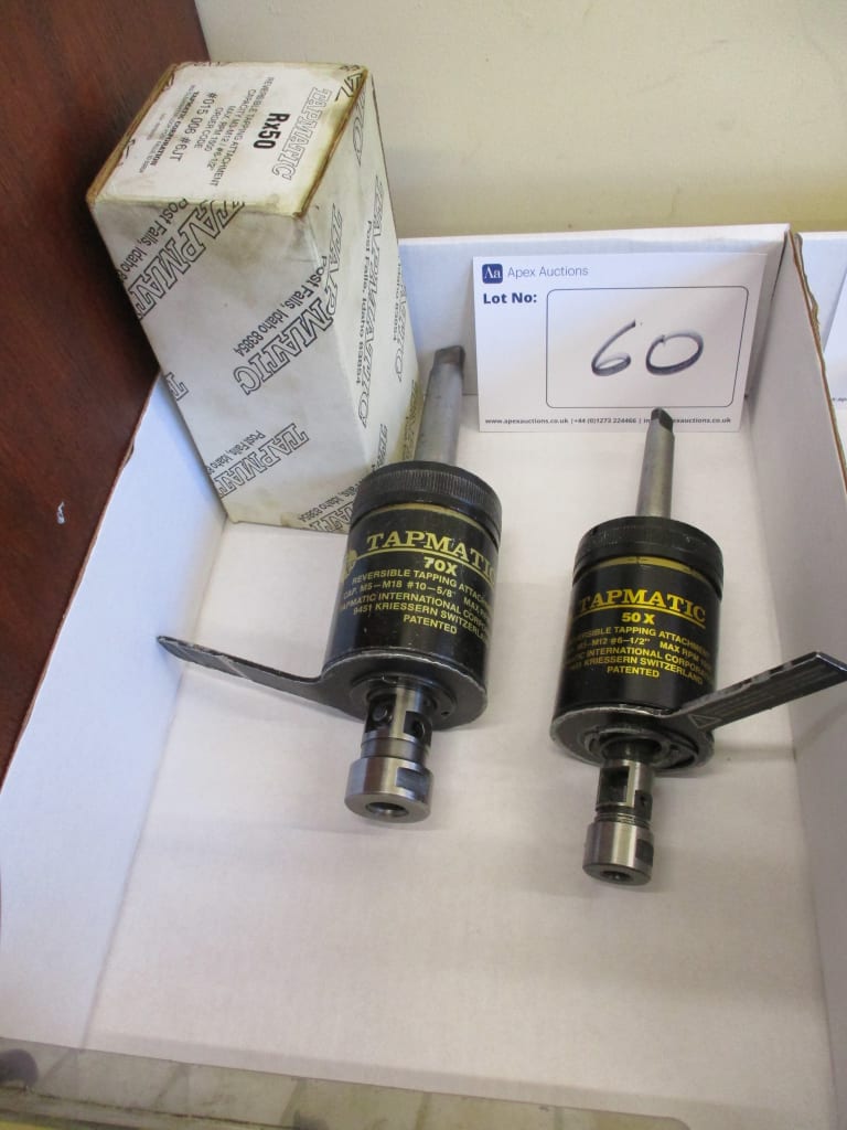 - View(2) Tapmatic Reversible Tapping Attachments on Morse Taper SleevesComprising: (1) 70X Tapmatic Reversible Tapping Attachment & (1) 50X Tapmatic Reversible Tapping Attachment.